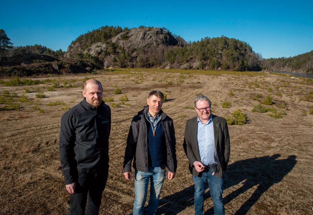 Område for Glamsland solkraftverk. Torstein Thorsen Ekern (Greenstat), Nils Cato Glamsland (grunneier/samarbeidspartner) og Einar Holmen-Hoven (ordfører Lillesand). Bilde fra Lillesandsposten.