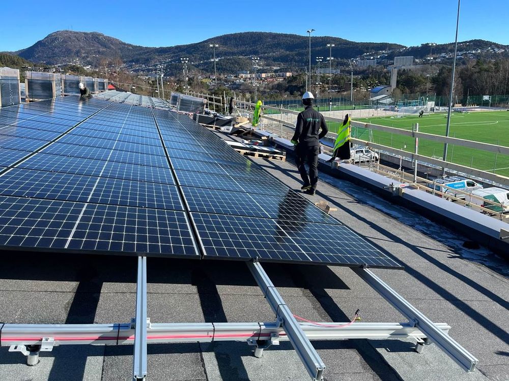 Bilde: Installasjon av sol-anlegg, Framo-hallen Bergen, 373 kWp.